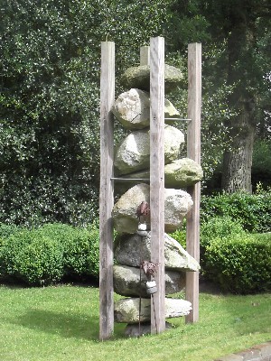 "........... In de achtertuin van een van de buren staat een best aparte sculptuur van tussen vier ruwhouten palen gestapelde zwerfkeien ............."