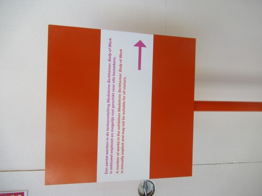 "........ Pas nu valt het bord bij de ingang van de zaal me op.... Zo'n modieuze waarschuwing die mij juist aanmoedigt om nog een keer langs het vele bloot te lopen ............."