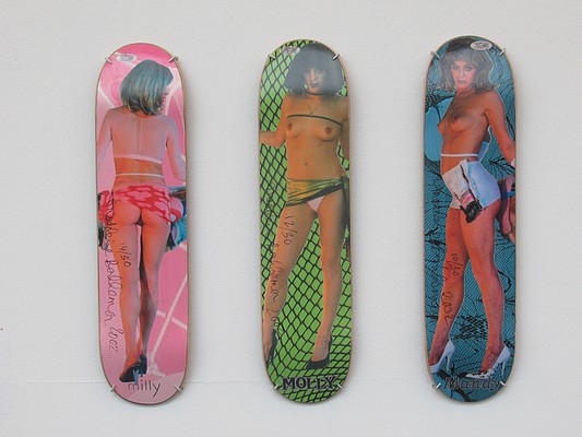 "........ en iets langer stil te staan bij de drie met half ontklede jonge vrouwen gedecoreerde skateboards ............."