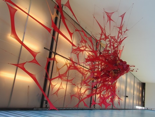 "........ aan het plafond haar Garden of Delight II is bevestigd. De installatie is een spinnenwebachtige pantysculptuur van zeer elastische rode panty's ............."