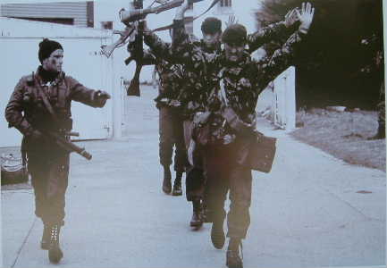 ".......... Zoals de foto van Britse militairen die met de handen in de lucht worden afgemarcheerd door door een Argentijnse soldaat. ................."