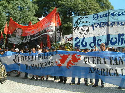 "........... Kingsize spandoeken met een afbeelding van de jonge Evita en een spandoek in de nationale kleuren waarop met fel rode verf het profiel van de Malvinas is gespoten en de tekst: ENGELSEN WEG UIT DE MALVINAS, YANKEES WEG UIT LATIJNS-AMERIKA! staat ..............."
