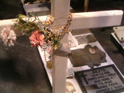 "........... Kruizen behangen met verkleurde plastic bloemen, met rozenkranzen, met hier en daar een naamplaatje of het opschrift “AN ARGENTINE SOLDIER KNOWN UNTO GOD”. Onder de kruizen ligt een collage van kleine gedenkstenen en bronzen plaquettes. ..............."