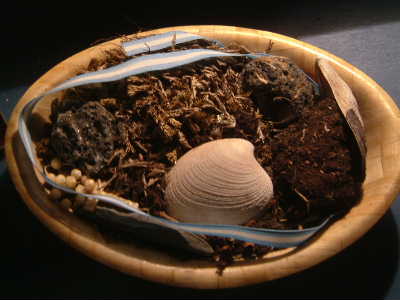 "........... Eveneens veel indruk maakt de collage van huisaltaren voor hen die vielen. Foto’s, meer rozenkranzen en kruisjes, maar bovenal de schalen met de aarde, heide, turf en schelpen opgeraapt op de Malvinas. De aarde waar hun geliefden het leven lieten voor het vaderland. ..............."