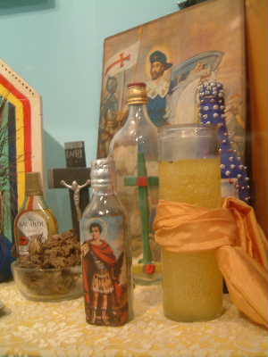 "...........Rechts ervan het portret van een ridder te paard, daarvoor staan een crusifx, een heupflesje rum, een blauw zakje waaruit een stekelige gedroogde bloem of kruid steekt, een kruis in een whisky fles – de enige echte message in a bottle – een flesje met een bidprentje als etiket, een schaal met noten of gedroogde vruchten, een kaars..............."