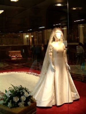"... in wat eens de salon was, staat een etalagepop met de trouwjurk van Máxima aan. Hoewel het een erg elegante etalagepop is, legt ze het ruim af tegen het origineel."