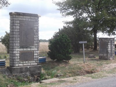 "........... Een groot monument en een wat kleiner monument, wat bomen, een picknicktafel, een vuilnisbak, ............."