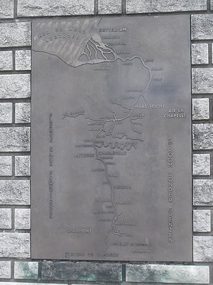 "........... Op het grotere monument een grote plaquette waarop de loop van de Maas en de zijrivieren vanaf de bron tot aan de Noordzee is afgebeeld met de toevoeging: STROOM ZONDER GRENZEN. ............."