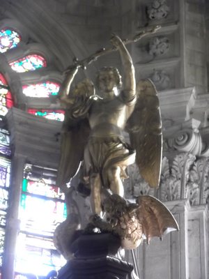 "........... Hoog in het koor staat een goud gekleurd beeld van Saint Michel die een draak doodt, hetgeen mij enigszins verwart. ............."