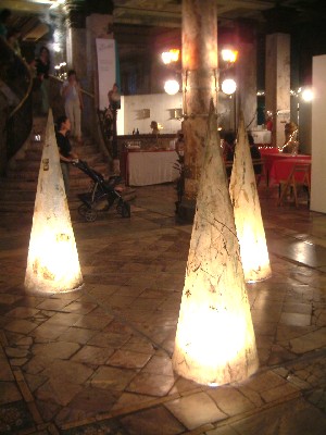 "...........Het lijkt wel of er op de vloer achter de vitrine van binnenuit verlichte ongekeerde ijshoorntjes staan en een andere installatie met roze lekkernijen van Mariana Ferrari. ............"
