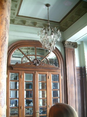 "........... Ietwat frivool staat dat alles tussen de met geslepen spiegelglas beklede statige hoge deuren, de in verval rakende gestuukte plafonds en de kroonluchters. ................"