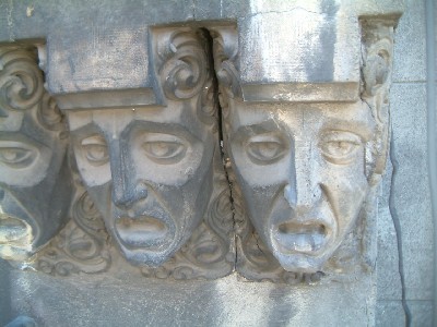 "............Aan het ene uiteinde sta ik min of meer oog in oog met drie uit steen hoofden van deze mooie façade en aan de andere kant met de sterk vergrote glas in lood lamp boven de ingang. De verlichting brand al lang niet meer, die lamp straalt helaas uitsluitend nog vergane glorie uit.