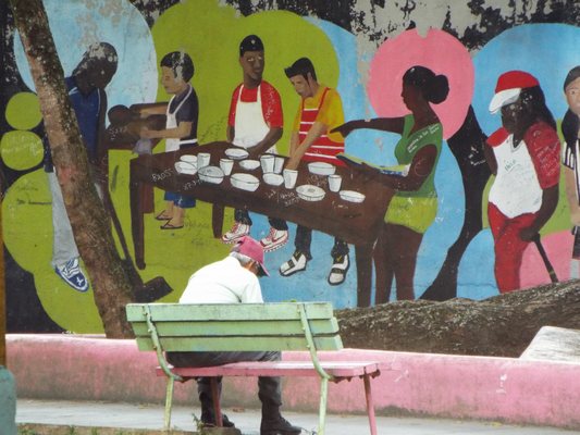 "........... De grote schildering op de buitenmuur van een school laat zien wat voor nuttige dingen er binnen worden onderwezen. ............."