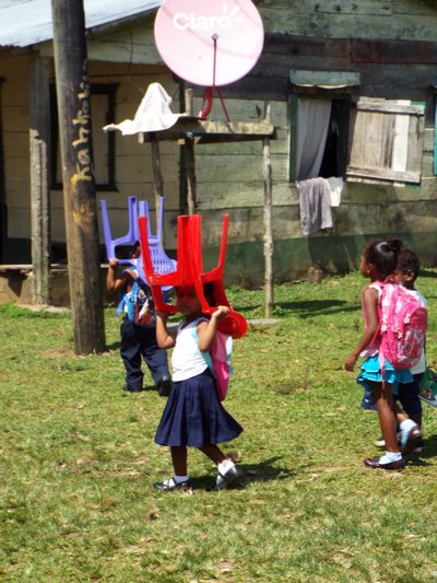 "........... Vervolgens komen ons kinderen in schooluniform tegemoet die de plastic stoeltjes, waar ze tijdens de schooluren op zitten, op de schouders mee terug naar huis nemen. ............."