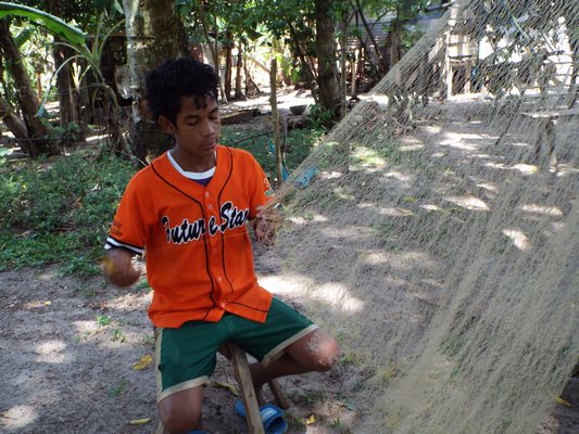 "........... Tot besluit gaan we langs bij een jongen die met nylondraad een visnet aan het knopen is ............."