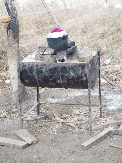 "........... Het houtvuur op het erf wordt gestookt in een overdwars doorgezaagde oliedrum met een rooster van betonijzer, ............."