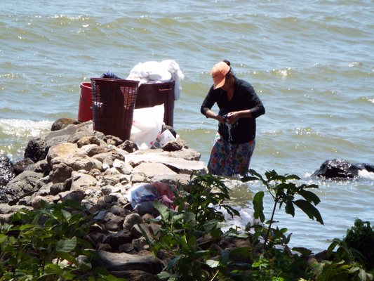 "........... vrouwen die tot hun middel in het meer staan om de was te doen, ondanks dat er stromend water is. ............."