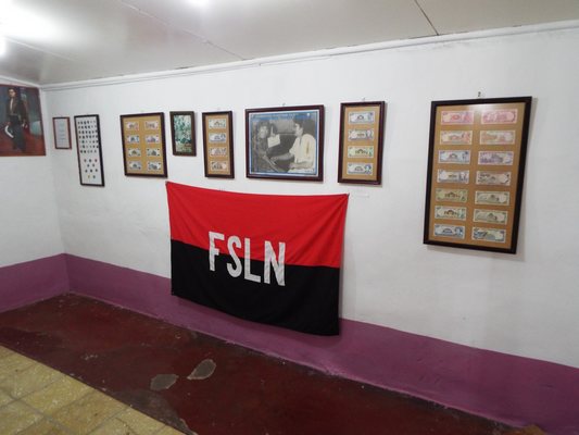 "........... aast het geld uit hun regeerperiode hangt het portret van de betreffende president, tot en met – hoe kan het ook anders – de rood-zwarte vlag van het Frente Sandinista. ............."