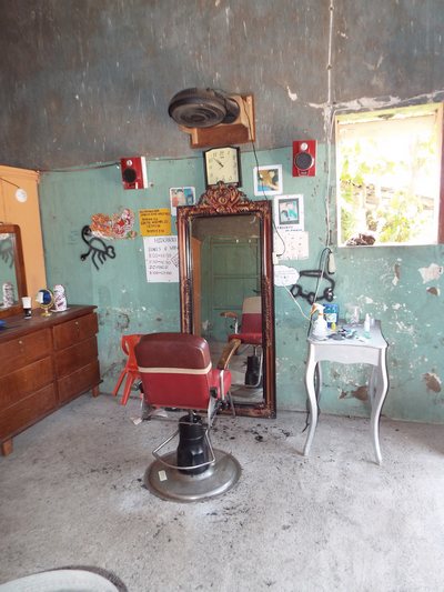 "........... waar ik uiteindelijk plaats mag nemen in de ouderwetse kappersstoel die voor een grote antieke passpiegel staat. ............."
