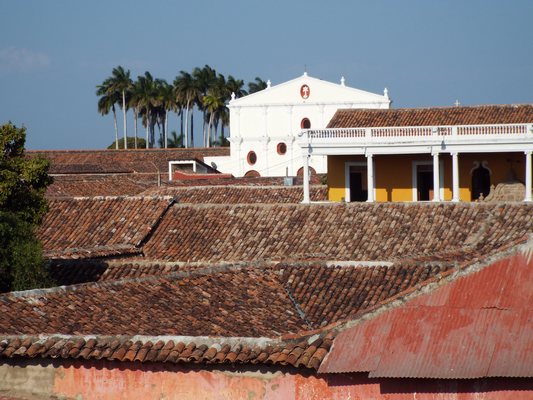 "........... Een kamer met een groot terras met uitzicht over de rode pannendaken van een stukje oude stad, met op de achtergrond de witte voorgevel van het Convento de San Francisco en groene palmbomen die afsteken tegen de strak blauwe hemel. ............."