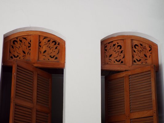 "........... Na rond de patio's de fraaie patronen van de gefiguurzaagde houten ventilatieroosters boven de deuren te hebben bewonderd, ............."