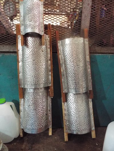 "........... en eenvoudige met de hand gemaakte keukenraspen – zo te zien zijn de raspgaatjes met een hamer en een spijker gemaakt – ............."