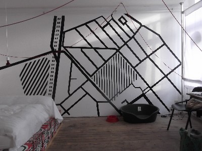 "........... De muurschildering lijkt op het eerste gezicht een abstract werkstuk, waarvan ik bij het wakker worden, als de ochtendzon er op schijnt, zeker weet dat het een gestileerde plattegrond van de Afrikaanderwijk is. ............."