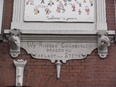 "........... aan de onderkant een tekst die is gevangen tussen de koppen van Joseph Chamberlain – Brits Minister van Kolonieën - en Cecil Rhodes – Eerste Minister van de Kaapkolonie - : “Wy Rhodes Chamberlain! dragen nu de last van Steyn”. Wat dat precies betekent heb ik tot mijn spijt niet kunnen achterhalen. ............."