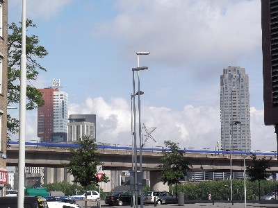 "........... Ga je midden op de weg van de Goede Hoopstraat staan, dan zie je vlakbij de behoorlijk contrasterende woontorens van de Wilhelminapier. ............."