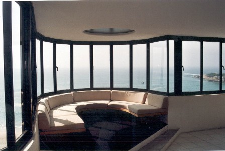 ".......... Een uurtje kregen we, niet meer. Strak meubilair, mooi uitzicht over Copacabana, Karl Marx in de boekenkast, tekeningen op en aan de muur, overal maquettes van nieuwe ontwerpen..........."