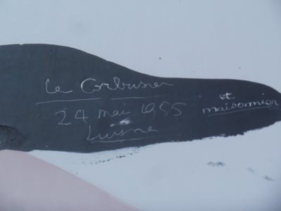 "........... Net als bij de grote betonnen flatgebouwen, is de ingang voorzien van de signatuur van Le Corbusier ............."