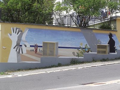 "........... Min of meer ter compensatie is er schuin aan de overkant op een buitenmuur een ode aan Le Corbusier te zien in de vorm van een grote muurschildering ............."