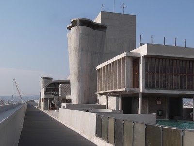"........... Het terras, een verkapte daktuin waar nauwelijks groen is te ontwaren, toont gelijkenis met het bovendek van een oceaanstomer met een dubbele brug. ............."