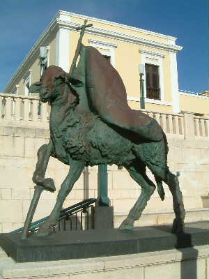 "..............Naast de trap naar boven staan twee bronzen beelden van uit de kluiten gewassen lammeren. Die verbeelden het lam God’s, het symbool van San Juan, dat naar San Juan Bautista - Johannes de Doper - is vernoemd. ....................."