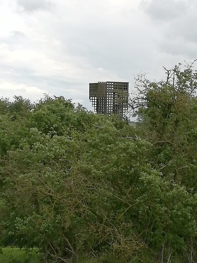 "........... Vanaf de overkant zie je niet niet meer dan een dijk waar boven het struikgewas en de niet al te hoge bomen een luchtige structuur uitsteekt ............."
