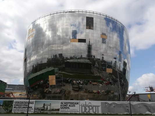 "........... een 40 meter hoog gebouw met een uit louter spiegels bestaande façade wordt gebouwd, ............."