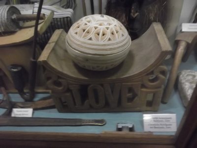 "........... door Fulani's fraai besneden kalebassen, ............."
