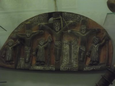 "........... en dan de unieke halfronde houtsnede die de kruisiging van Jezus op Golgotha verbeeldt. Post-bekeringskunst die weergeeft wat plaatselijke ambachtslieden op basis van de ongetwijfeld beeldende verhalen van missionarissen hebben gemaakt. ............."