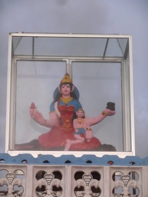 "........... het symbool van Shiva, de godin met de vier armen wiens beeldtenis zowel voor de tempel op de dijk staat, als in een glazen vitrine op het dak. ............."