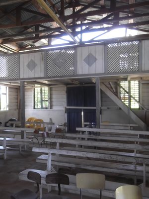"........... Voor de kerkgangers staan er diezelfde ongemakkelijke witte banken die ik uit de Moravische kerken in Zuid-Afrika ken, ............."