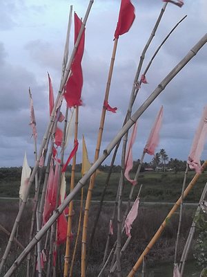 "........... vlaggen in de tuinen bij de huizen langs de weg verraden het Hindoegeloof van de bewoners. ............."