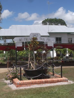"........... “WI FRI, WI DE TAN FRI” staat er op de “ereboog” boven zo'n grote verroeste pan die destijds op de suikerplantages werd gebruikt, “WE ZIJN VRIJ, WE BLIJVEN VRIJ”. ............."
