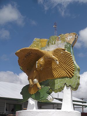"........... Ook aan de inheemse bevolking is gedacht in de vorm van een grote roofvogel die tegen de kaart van Suriname is geplakt, met in zijn klauwen zo te zien een inheemse Surinamer. ............."