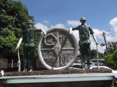 "........... het Bevrijdingsmonument. Bovenop de sokkel leunen twee soldaten op een “wiel” met daarin de afbeelding van een schip, een boortoren, het nationale wapen en iets onbestemds dat ik niet kan thuisbrengen. De datum op de voet – 25 februari 1980 – verwijst naar de “Sergeantencoup”, de militaite staatsgreep onder leiding van Desi Bouterse en Roy Horb ............."