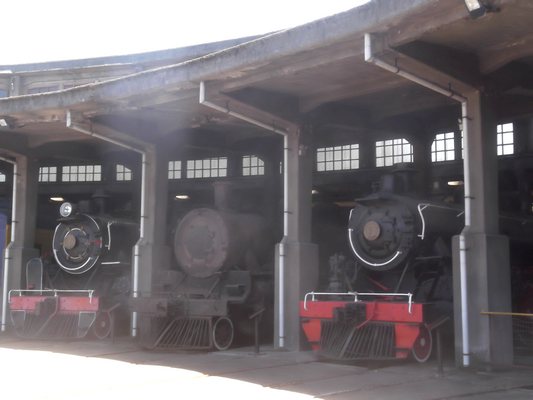 "........... Die locs staan zij aan zij naast elkaar geparkeerd in het CASA DE MÁQUINAS, de bijzondere in een cirkelvorm gebouwde voormalige onderhoudswerkplaats. ............."