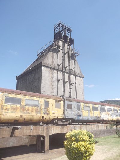 "........... Een ander origineel gebouw dat tussen die aftandse treinen staat is de 40 meter hoge Carbonera, de kolensilo. ............."