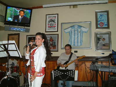 "........... De zangeres staat vrijwel onder het scherm waarop Boca speler Riquelme wordt geïnterviewd. Het stoort haar niet, de beeldschermen zijn geluidloos en de mime haalt niet bij die van Marcel Marceau of Mr. Bean. Achter haar hangt ook nog eens een ingelijst shirt van het Argentijnse voetbalelftal, net of ik thuis in Buenos Aires ben. ..............."