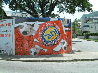 "..............Om maar niet te spreken van alle andere buitenreclame van de sponsors. “Drink Carib Beer – Support the Soca Warriors” hetgeen ik met enig enthousiame doe....................."