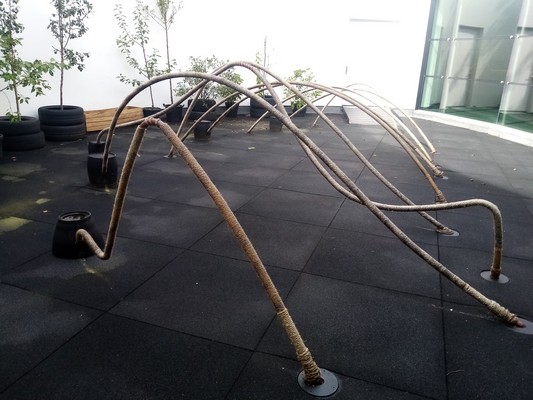 "........ Het speelobject bestaat uit een stuk of tien heel verschillend gekromde metalen buizen ............."