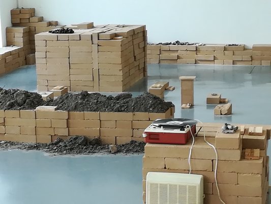 "........... Om haar boodschap vorm te geven gebruikt de kunstenares een beperkt aantal materialen: heel erg veel grote bakstenen, ............."
